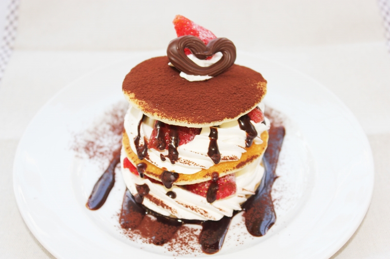 レストハウスで、この度新メニューが登場! その名も『エンジェルパンケーキ』一番上にハートのチョコレートが 価格は500円で、静岡らしく苺もトッピング、インスタ映えまちがいなし!!